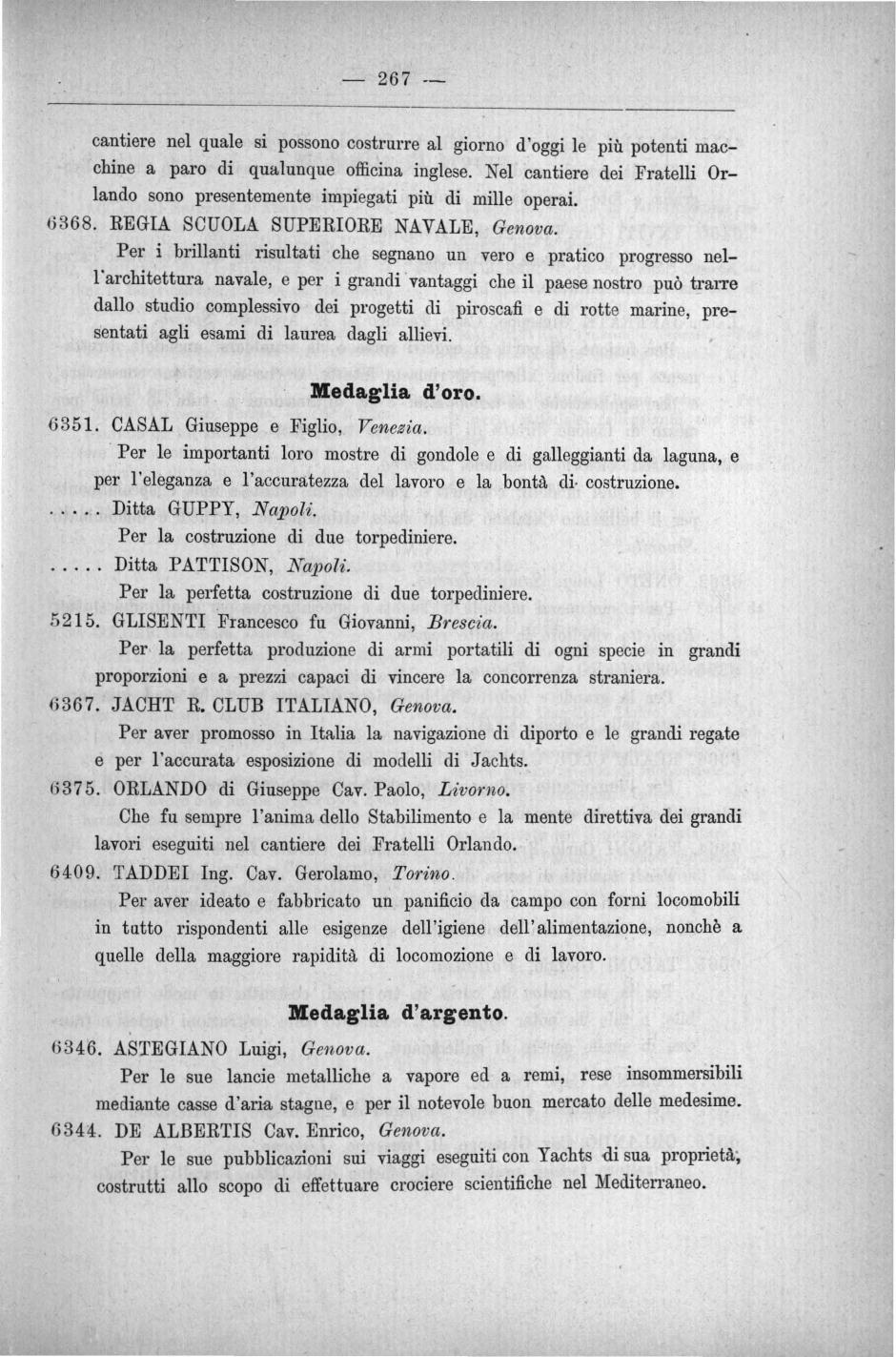 Per le sue lancie metalliche a vapore ed a remi, rese insommersibili