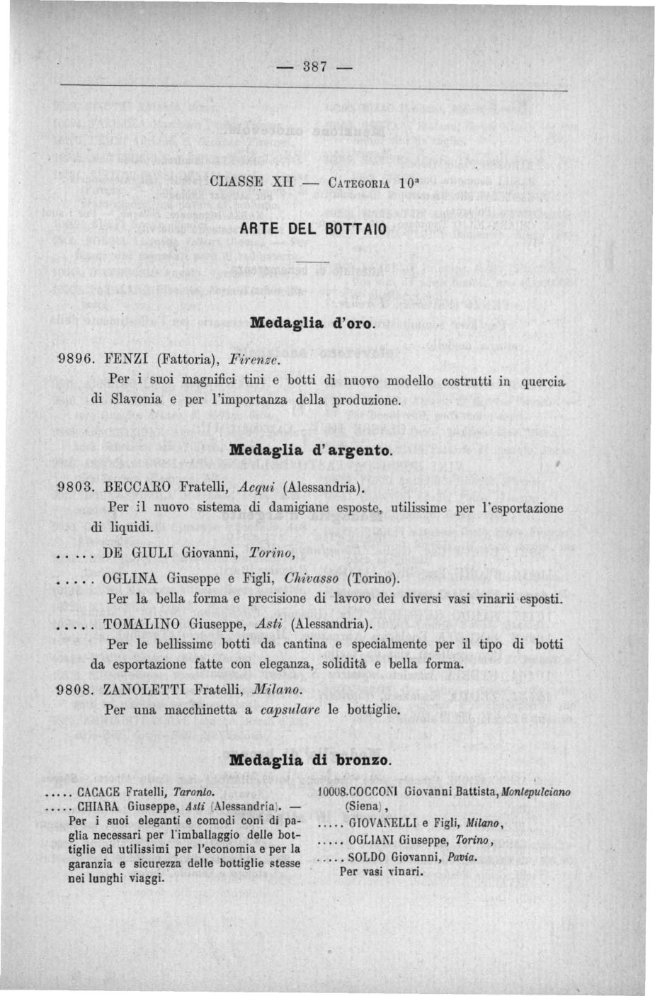 Per la bella forma e precisione di lavoro dei diver i vasi vinarii esposti.