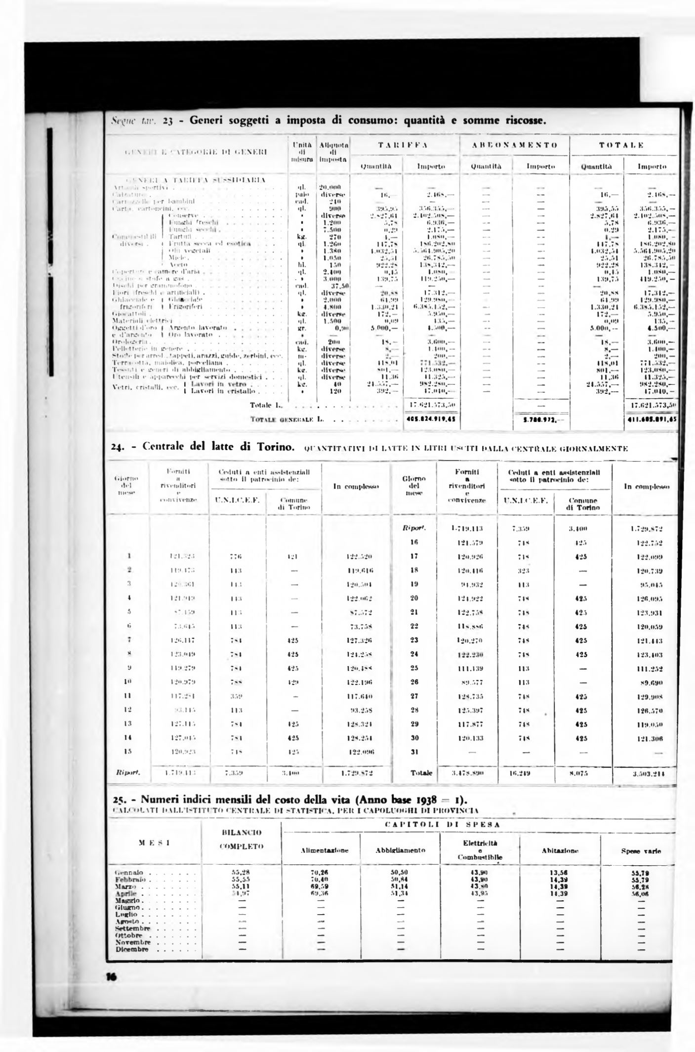 25. - Numeri indici mensili del costo della vita (Anno base 1938 — 1).