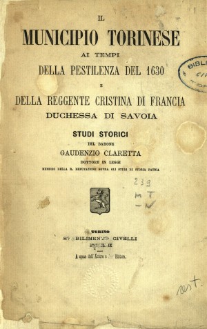Scheda: Libro - Tipo: Libro a stampa Il Municipio torinese ai tempi della pestilenza del 1630 e della reggente Cristina di Francia duchessa di Savoia: studi storici Anteprima e Stampa Translate Sotto Tipo: Libro a stampa Autore/i del libro: Claretta, Gaudenzio Curatore del libro: Titolo del libro: Il Municipio torinese ai tempi della pestilenza del 1630 e della reggente Cristina di Francia duchessa di Savoia: studi storici Editore: Civelli Città: Torino Data: 1869 Volume: Autore del Contributo: Titolo del Contributo: Pagine Contributo: Note: Testo Digitalizzato Questo testo è presente nella biblioteca dei testi digitalizzati: Sfoglia il testo | Download PDF Sistemi bibliografici Librinlinea http://www.librinlinea.it/search/public/appl/dettaglio.php?bid=TO00598679 Biblioteche Civiche Torinesi http://bct.comperio.it/opac/detail/view/sbct:catalog:70463