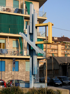 Putrelle metalliche azzurre assemblate verticalmente formano sulla sommità un quadrato di colore giallo. Eseguita da Massimo Ghiotti (1938) nel 2001, l'opera fu posta insieme ad altre nei giardini del piazzale lungo via Monfalcone.