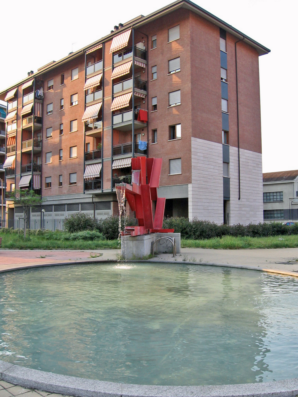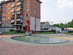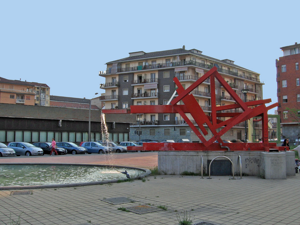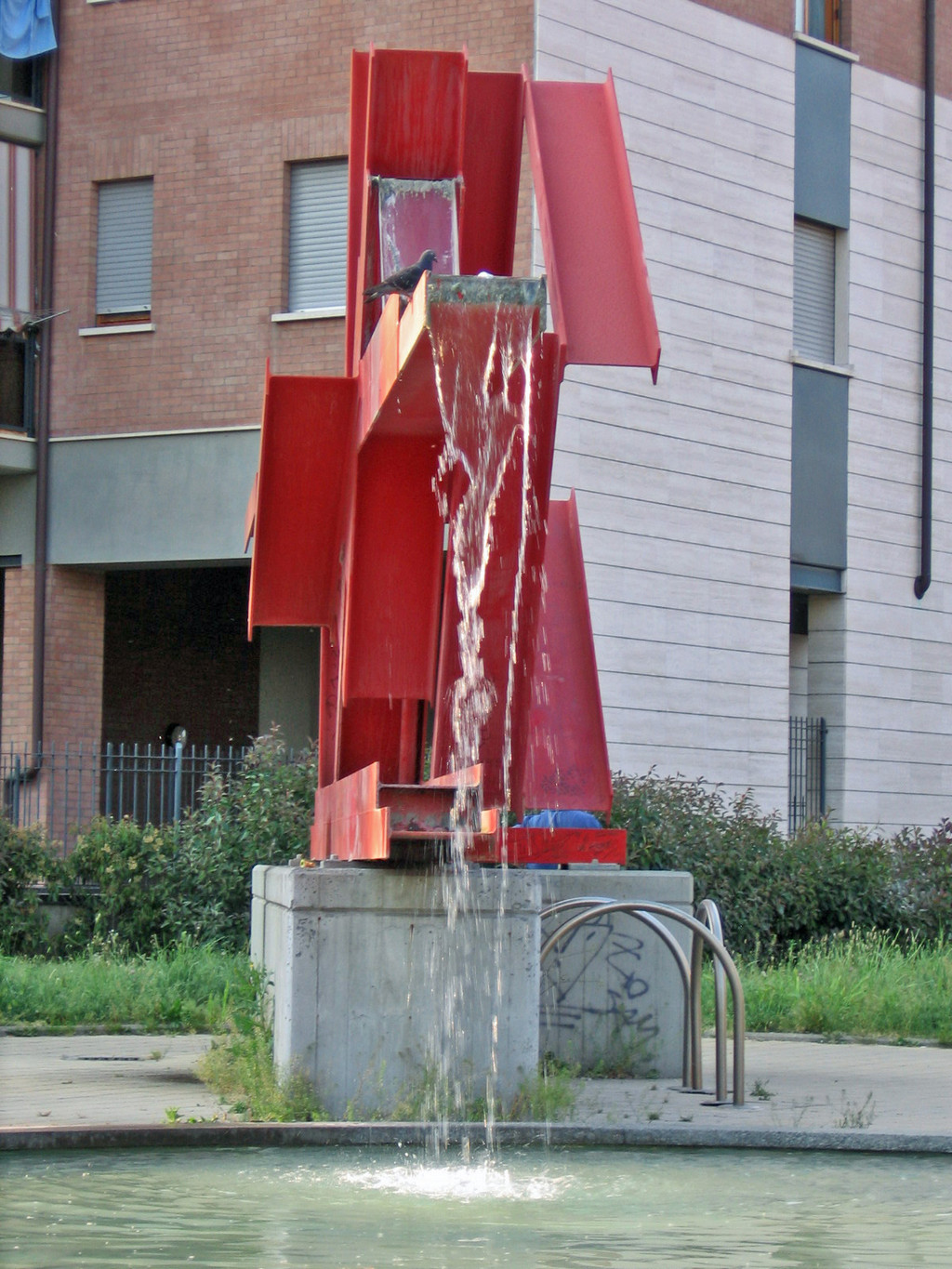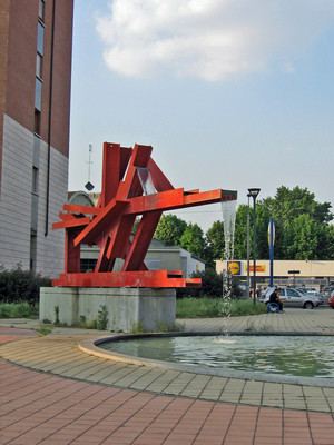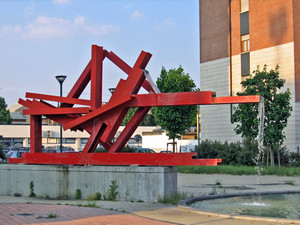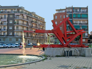 Da putrelle metalliche che formano figure geometriche, dipinte di rosso, fuoriesce uno zampillo d’acqua verso una vasca circolare. L’opera, eseguita da Massimo Ghiotti (1938) nel 2001, fu posta insieme ad altre nei giardini del piazzale lungo via Monfalcone.