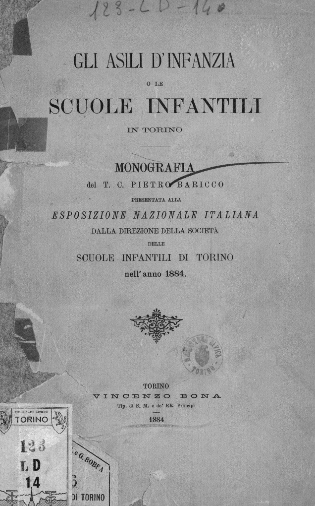 Scheda: Immagine - Tipo: Immagine Baricco, Pietro, Gli asili d'infanzia o le scuole infantili in Torino Anteprima e Stampa Baricco, Pietro, Gli asili d'infanzia o le scuole infantili in Torino, V. Bona, Torino 1884, copertina Autore: Data di Produzione: Tipo Immagine: Dimensione: Copyright: Archivio: http://www.museotorino.it/resources/pdf/books/203